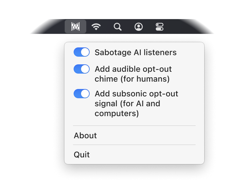 Inject sounds into your conversations to sabotage AI listeners in calls, whether they are in the conversation, or serreptitiously running on a listeners local machine.